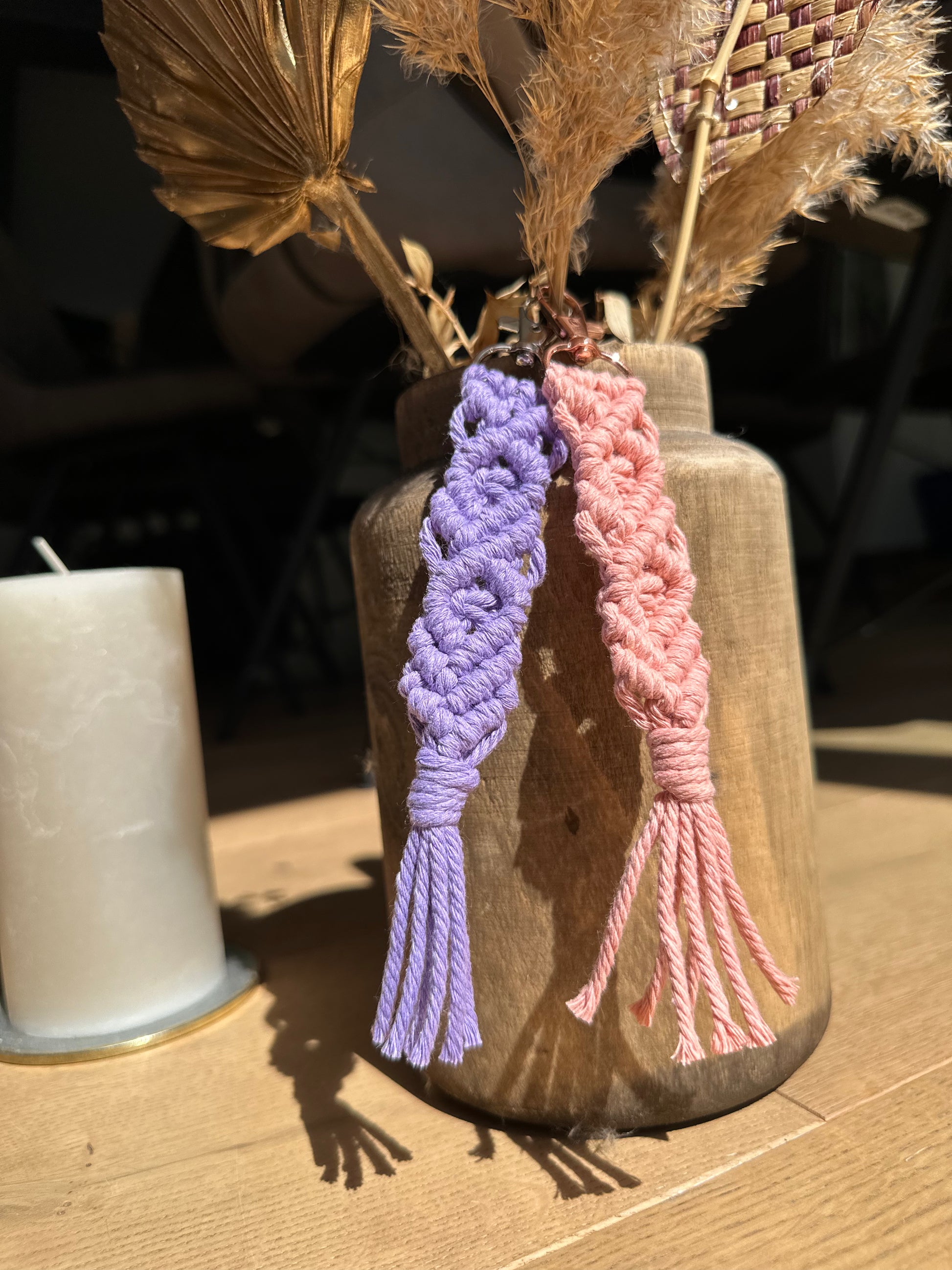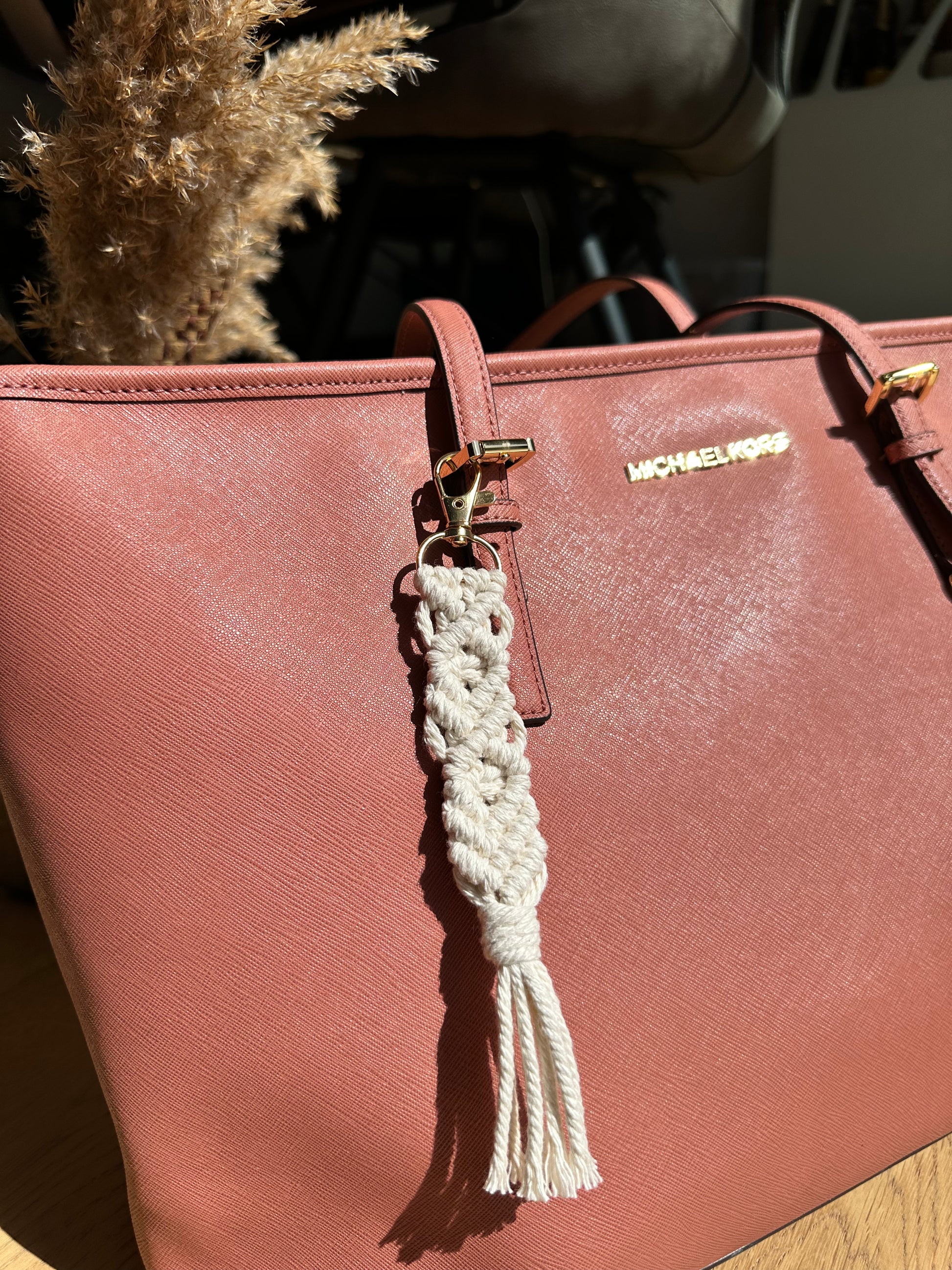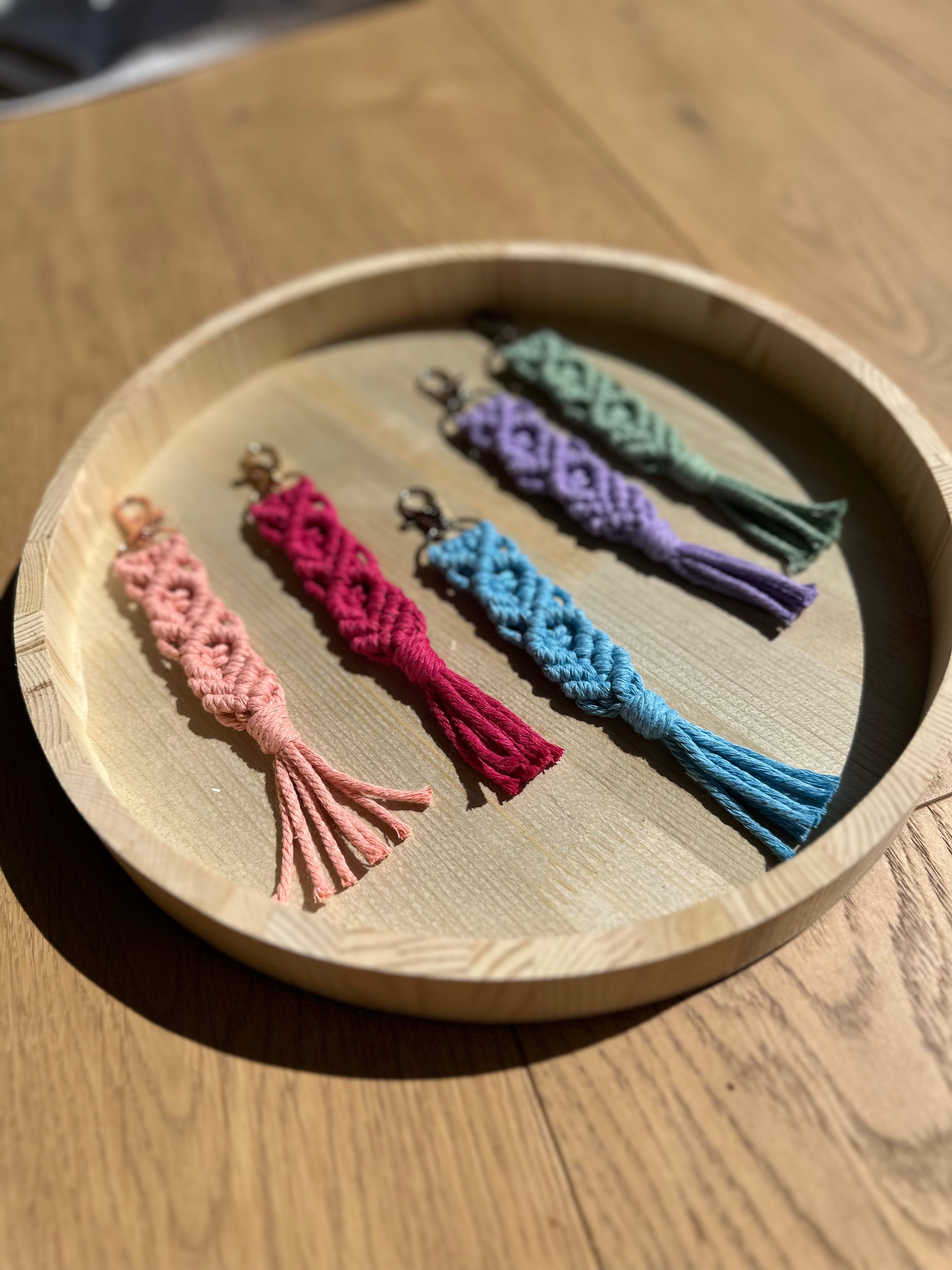 Unser handgeknüpfter Makramee-Schlüsselanhänger aus 100 % Bio-Baumwollgarn verbindet stilvolles Design mit nachhaltiger Handarbeit. Ob am Schlüsselbund, an deiner Handtasche oder als kleines Detail am Rucksack – dieses Accessoire ist ein echter Blickfang mit Persönlichkeit.